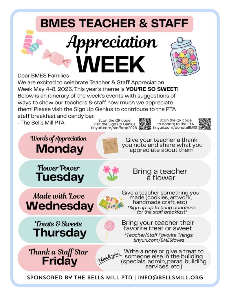 Teacher and Staff Appreciation Week is May 4–8, and the Bells Mill PTA is excited to celebrate the incredible teachers and staff who make Bells Mill such a special place for our children each day. Throughout the week, we will be treating the BMES staff to breakfast, lunch, and other surprises to show our gratitude for all they do.